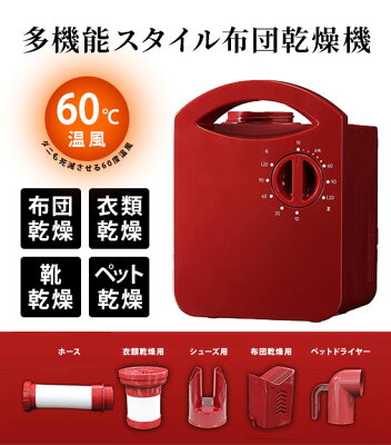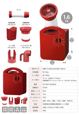 HIRO 多機能スタイル布団乾燥機 RM-98H の詳細 商品名 HIRO 多機能スタイル布団乾燥機 RM-98H カラー レッド サイズ 約幅175×高さ236×奥行146mm 本体重量 約1.6kg コード長さ 約1700m ホース長さ ホース:約230〜715mm 衣類乾燥アタッチメントホース:約140〜310mm 電源 AC100V 50/60Hz 消費電力 570W 温度ヒューズ 94度 電流ヒューズ 10A サーモスタット 70度 タイマー 送風:60分温風:120分(温度:約60度) 保証期間 お買い上げ日より1年間(本体) 使用上のお願い この布団乾燥機は家庭用です。