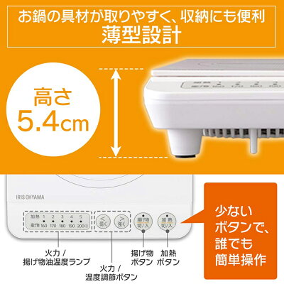 ■商品サイズ(cm)幅約24×奥行約28.6×高さ約5.4 ■本体重量約1.7kg ■電源 AC100V(50/60Hz) ■定格消費電力 1000W ■電源コード長さ 約1.5m ■ヒーター IHヒーター 1000W ■火力調節 加熱調理:5段階(火力)80W相当〜1000W 揚げ物調理:5段階(油温)約160〜約200℃ 【使えるなべ】 ・材質 鉄・鉄鋳物、鉄ほうろう、ステンレス、多層鋼なべ※種類によっては発熱しないことがあります。